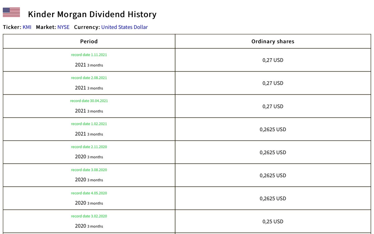 Find the latest dividend history for Kinder Morgan Inc. A cash dividend payment of 027 per share is scheduled to be paid on November 15 2021.